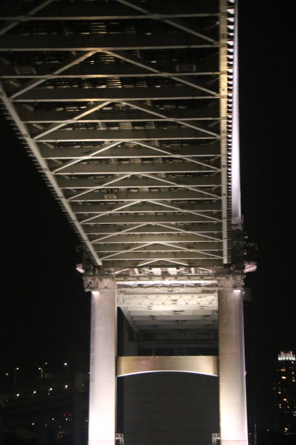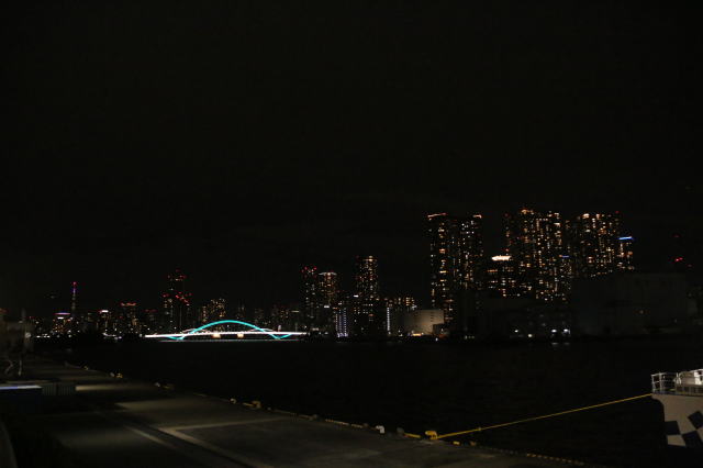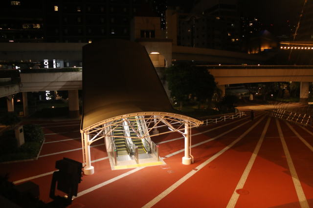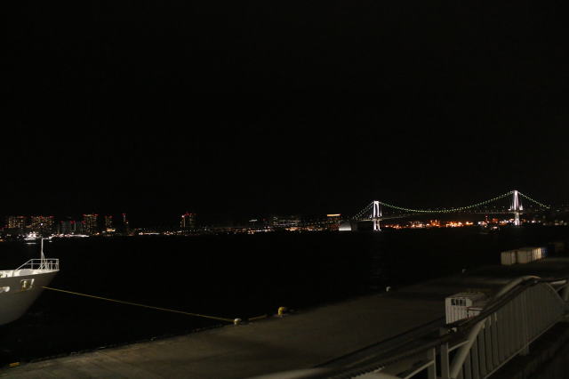 | 船の出航は22:30なので、夜の竹芝桟橋です。 駅のすぐ横まで遊歩道ができていて、最終的にはここにたどり着きます。 ただ、手前のビルのところで階段なので、大きな荷物を持った人とか使わないのでは? なぜ、完全フラットにしなかったのでしょうか? |