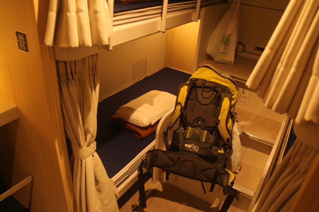 | 乗船時間になり、まずは荷物を置きに。 特二等を取ったのですがガラガラ。 特二等は上下に分かれた2段ベッドなのですが、二等は横に仕切りが無いだけで上は開放的。 どっちが良かったのかは分かりませんが、頭のところに貴重品入れがあるなど、新しい船だけあって装備は十分で快適でした。 まあ、初めてだしこれはこれで良かったと思います。 |