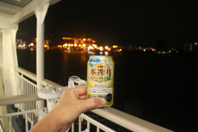 | さて、船旅と言えば祝杯は必須。 とはいえ、すぐに寝るので控えめに。 |