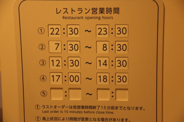 | 行きは夜中に出発ですが、一応1時間だけレストランは営業するようです。 朝は八丈島に着く直前までの営業なので、三宅島や御蔵島で降りる人は利用できません。 まあ、帰りの人向けかな? |
