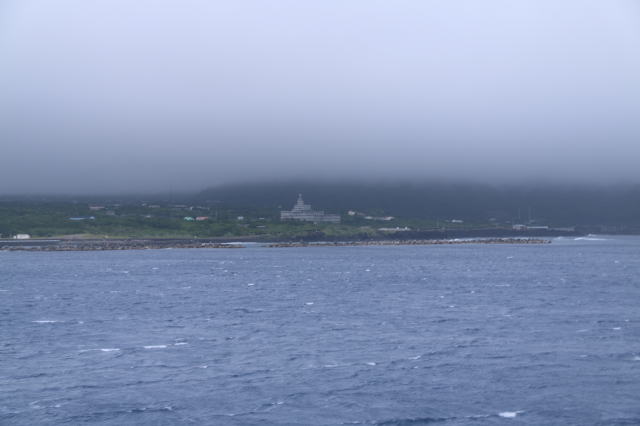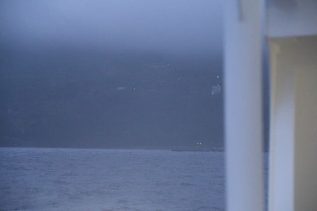 | 早朝朝焼けが見れないかと少し早めに目覚ましをかけてみました。 ほどなくアナウンスがあり、三宅島が近づいてきました。 薄暗い中見えてきたのは、ほぼ霧に覆われた島でした。 |