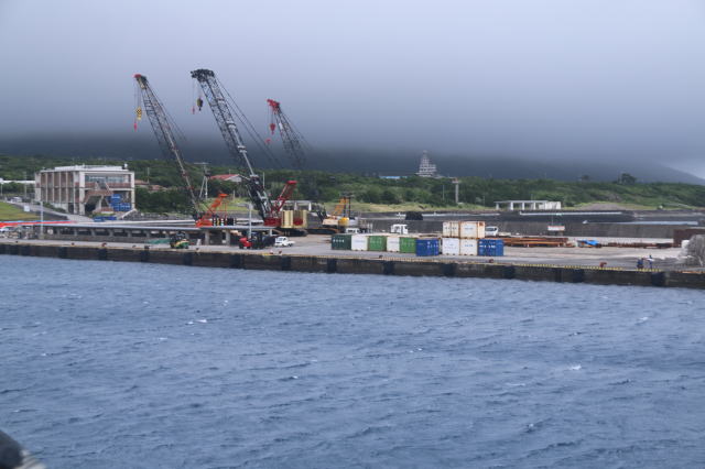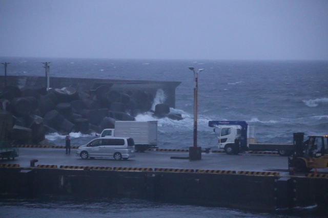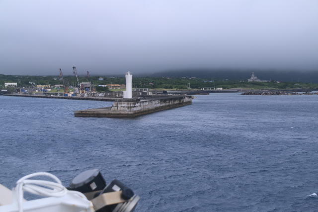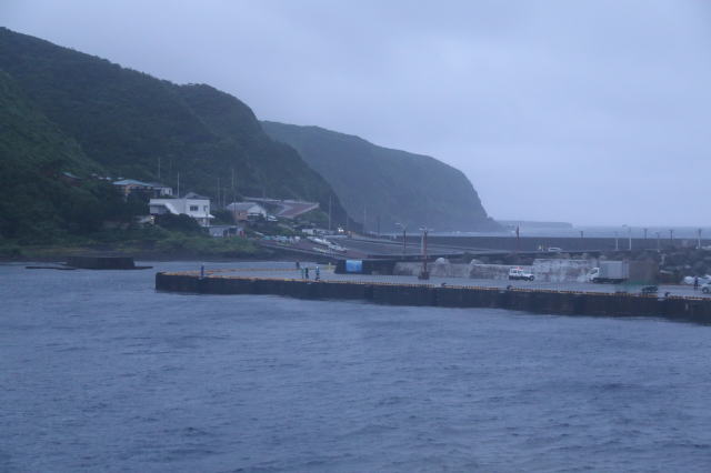 | 三宅島の伊ヶ谷港のようです。 三宅島は大型船が停泊できる港が3つあって、風裏・浪裏になる港に停泊することで就航率を上げているようです。 ただ、噂に名高い御蔵島と同じで護岸が無く、いきなり桟橋が突き出ています。 |