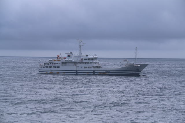 | 次の島、御蔵島は早々と連絡が入り、接岸不可。 島に近づくことすらなく八丈島へ。 八丈島は特に問題もないらしく、多くの場合船が着く底土港へ向かいます。 底土港の少し手前に、八丈島と青ヶ島を結ぶ、くろしお丸が錨を降ろして停泊してました。 青ヶ島は・・・今日は無理だろうなぁ。 |