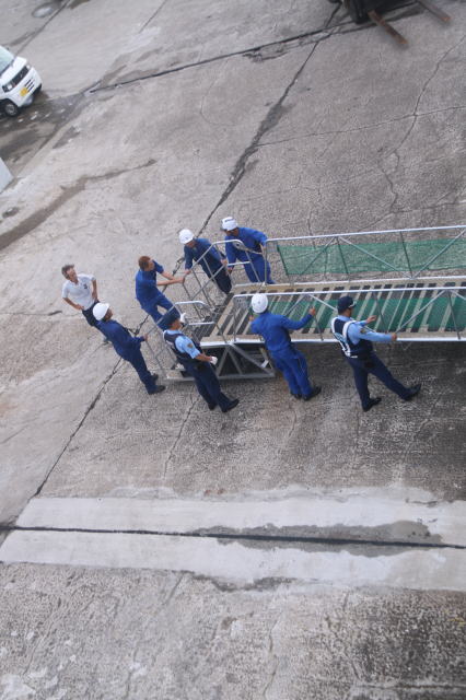 | 船の側にあるワイヤーをひっかけて、引っ張って持ち上げてタラップを接続させます。 最後はお巡りさんが調整してます♪ |