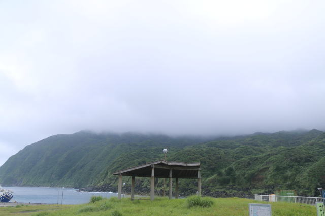 | ようやく島に着いたら、こんな天気でした。 近くの山?は下の方しか見えてませんね。 |