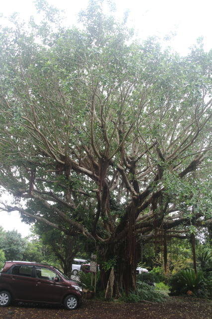 | 初日に温泉で出会った人と昼食に行った、「いそざきえん」。 島の郷土料理を食べられます。 駐車場の入口に巨大なガジュマルが植わっていました。 軽自動車と比較してみると、その大きさが分かります。 |