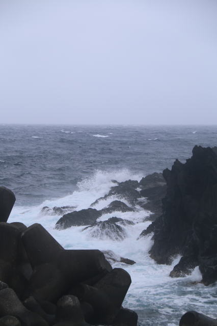 | 底土港の反対側、船が泊まれるもう一つの港がある八重根港のすぐ横の岩場です。 暴風が西風で、八重根港は西側にあるので、もろに巨大な波が打ち付けていました。 |