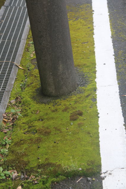 | そこら辺の電柱の根本です。 良い感じでアスファルトの道路が苔むしてます。 島全体が湿度の高い島らしく、至る所が苔むしてました。 屋久島みたい・・・ |