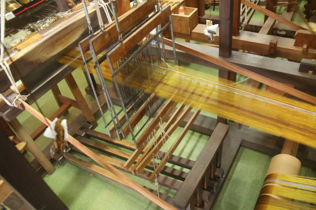 | 底土港付近でお土産屋を探していたら見つけた、黄八丈の機織り体験できる店。 江戸時代の特産品でお米の代わりの年貢だったんだそうです。 |