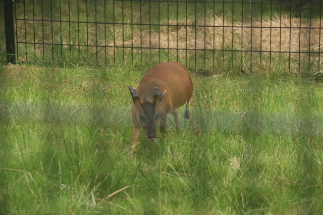 | 八丈植物公園には、小さなシカの仲間のキョンが飼育されていました。 オスメス分けて、数頭いました。 こちらは角があるオスです。 |