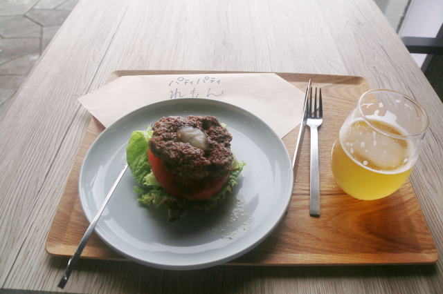 | 肉が来ました! そして、ビールも新しいものが来ました! ハンバーガー屋なのですが、パティパティというバンズの無い肉で野菜を挟んだものもあり注文してみました。 お肉は割とさっぱりで、200gで頼んだのですが、300gくらいは余裕で行けると言っていた店長の言葉どおりでした。 ただ、宿の晩飯の量が半端ないので、追加注文は止めておきました。 |