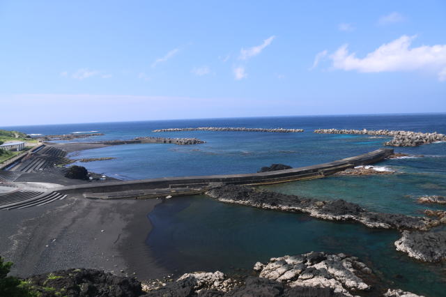 | 底土港の海水浴場です。 この囲われたエリアが海水浴場であり、シュノーケルもこの中で行いました。 ダイバーさん達は、この堤防にある階段から海に入って、堤防の切れ目から外の深いところに向かうようです。 |