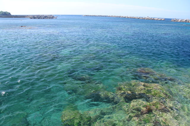 | 海水浴場の外側の岩礁地帯です。 海がエメラルドグリーンで綺麗ですね。 |