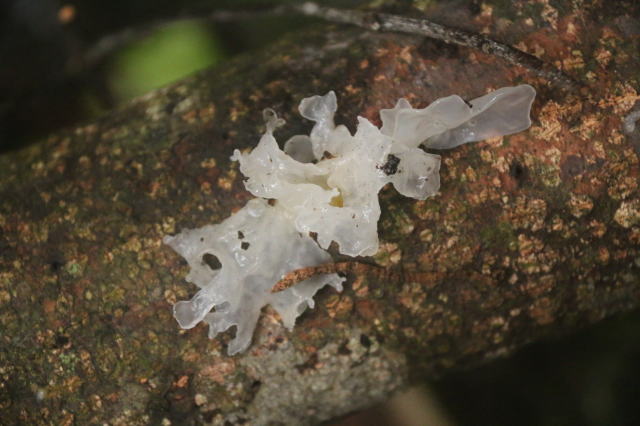 | 最初の目的地「こん沢甌穴群」に向かう道路は風で木々がなぎ倒されている危ない道。 レンタカーでは通らないように言われるのだとか。 道に倒れてバラバラになった木には、真っ白なキクラゲが付いてました。 |