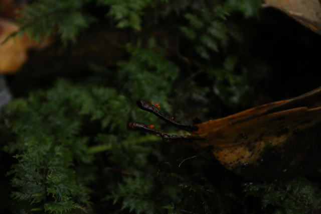 | なぜか落ち葉の軸だけに生える不思議なキノコ。 とっても小さくて、写真を撮るのが凄く難しい。 画鋲みたい・・・ |