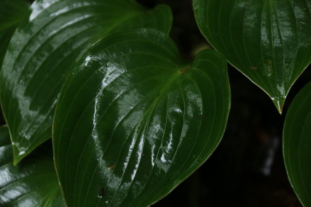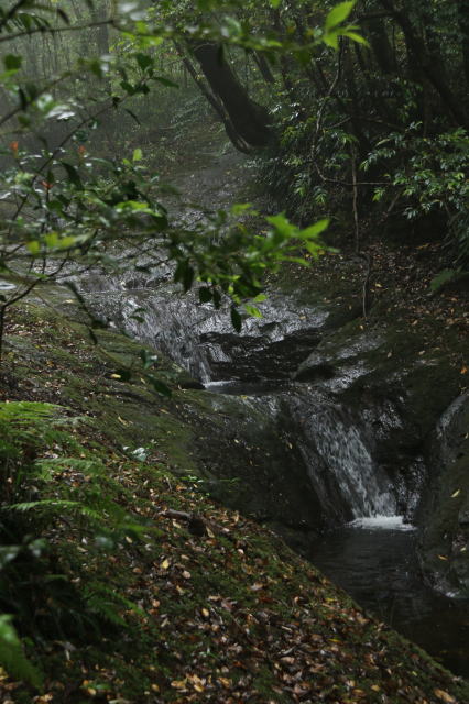 | 何の葉っぱか分かりませんが、霧の中でピカピカの葉っぱを見つけました。 常時潤っているんでしょうね。 |
