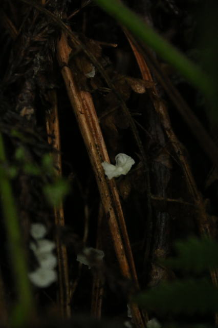 | 白いキノコですが、上の写真の物とは別の種類のようです。 小さな木が枯れた後で分解するのがこのキノコのお役目のようですね。 |
