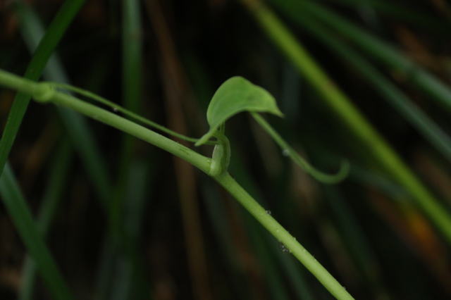 | この太いのはバラの一種なんだそうな。 でも棘は退化してしまっています。 八丈島では、なぜか植物の棘やギザギザが退化して丸くなってしまうようです。 外敵が居ない中で、ツンツンする必要はないってことみたいですね。 |