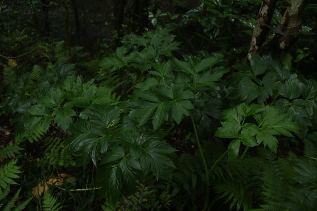| 明日葉が森の中で自生していました。 このくらい大きくなると、もう食べられないそうです。 なぜか一カ所にまとまって群生していました。 |