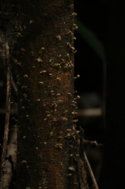| 極小サイズのキノコ。 このキノコはパット見木の表面に毛のようなものが生えているのかと思いました。 まだ生きている木についていたのはなぜ? この木は弱ってるのでしょうか? |