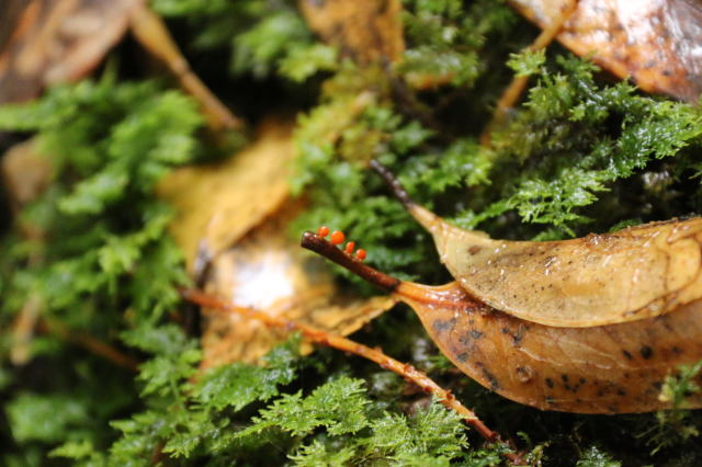 | 落ち葉の軸にだけ付くキノコが綺麗に並んでました。 ミクロの世界にも、色々なドラマがありそうな、そんな感じがしますね。 |