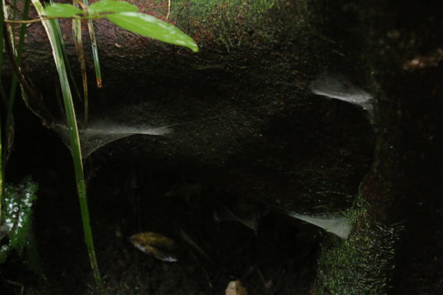 | なぜか八丈島のクモの巣は横にすり鉢状に作るようです。 しかも、くぼみなどの場所にあるので、飛んでる虫には向かない気がします。 地面を這うような、何か特定の種類の虫を捕まえているのだと思います。 |