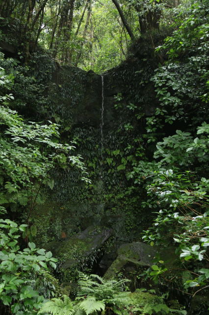 | 次の場所へ車で移動中に見つけた滝。 写真ではわかりにくいですが、高さはかなりあって20mくらいはあったでしょうか。 細く流れていますが、常時こんな感じらしいです。 確かに太く強く流れたような跡は見当たりません。 三原山から周囲に均等に流れ落ちてくるらしく、絶え間なく一定の水量で流れているようです。 |
