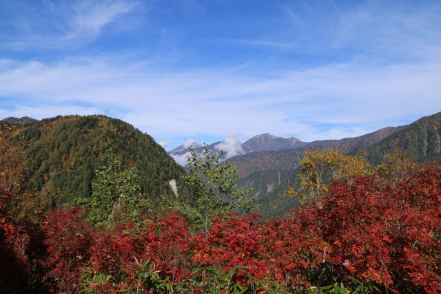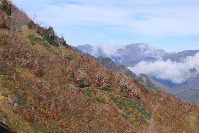 | 一気に標高を上げるせいか、上の方は気がまばらで、すでに落葉し始めているようです。 山肌の雲も標高の高さを物語っています。 |