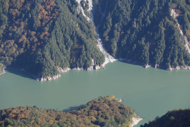 | 黒部湖の緑と森の緑に白い岩肌のコントラストがたまりません。 |