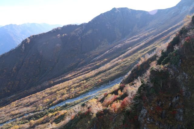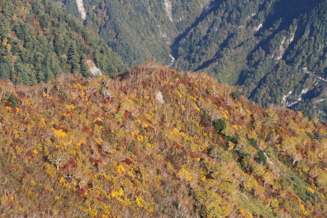 | 斜面に沿うように届く日差しがまるで夕日のように紅葉した山の斜面に陰影をつけてますね。美しい。 |
