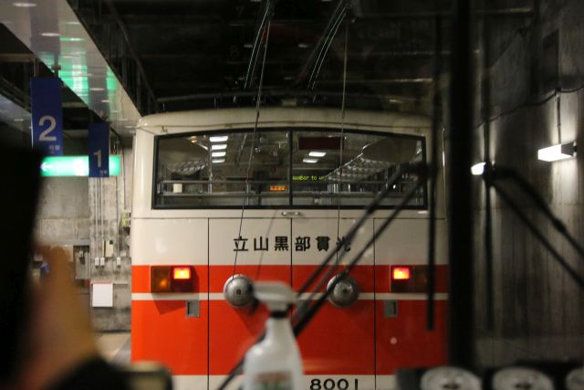 | 雪のエンブレムが輝くトロリーバス。恐らくほぼ誰も読まないだろうに、室堂-大観峰の文字が書かれています。 |