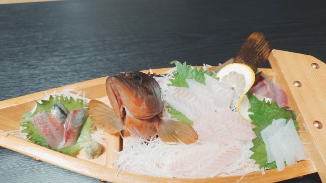 | そして、刺身の船盛の登場!中央に鎮座するはキジハタ!周囲には数種類のお刺身!氷見はブリだけでなくとても豊かな漁場なんだそうです。 |