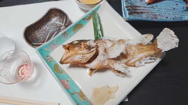 | 今回のメインはカニかと思ったら、まずこれが温かいうちに食べてと言われちゃいました!キジハタの塩焼きです! やっぱりハタ科の魚は美味い!それにしても見事な化粧塩!見た目も味も最高でした! |