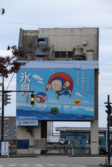 | そして氷見漁港の入り口には巨大なハットリくんの看板です。そこはブリじゃないんだ・・・。 |