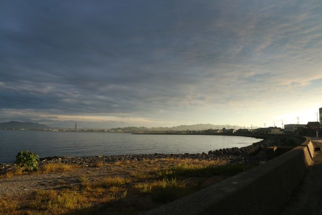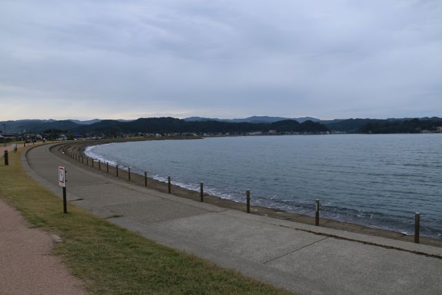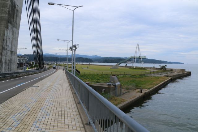 | 道の駅でお土産を買って、足湯でのんびりして、チェックインの時間を潰せたので再び歩きます。 宿までは30分くらいはありますが、海沿いの公園は気持ちいいので歩くことにします。 |