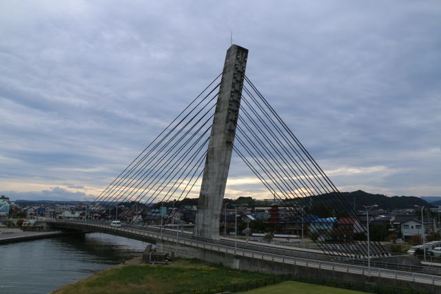 | 比美乃江大橋はかなり大きなつり橋でした。正確にはつり橋の一種ですが斜張橋と呼ばれる種類の橋だそうです。 |
