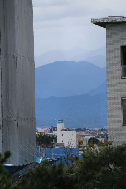 | 展望台からの立山方向です。残念ながらビルが多い方向で、ビルの隙間からチラ見できる程度でした。 |