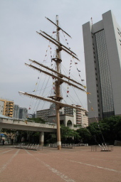 | この帆船のマストだけが立っている広場こそ桟橋前の広場です。 この正面からおがさわら丸に乗りました。 |