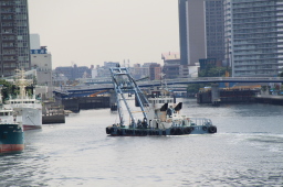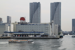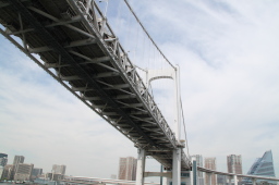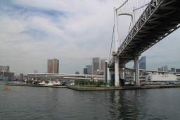 | レインボーブリッジを下から眺めることができるのは船だけです。 泳げば見れるって?この汚い海に飛び込む勇気がある方なら 見ることができるのかもしれませんが… |