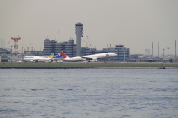 羽田空港付近 このページでは、羽田空港付近で撮影した写真を紹介します。 今回の旅行とはあまり関係ない気もしますが、このアングルで撮ることは船からしかできないので、 撮りまくってみました。 カメラの連写機能のテストも兼ねて、羽田空港から離陸する飛行機を連射してみたりしました。 枚数が多すぎてアップできませんけど。 ※写真はオリジナルサイズのままではサイズが大きすぎて挙げられないので縮小してあります。