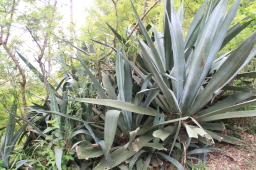 | 竜舌蘭(リュウゼツラン)です。 でっかいサボテンです。 これひとつで大人の背丈ほどもあります。 数十年に1度しか花を咲かせないらしいですが、 その花はオガサワラオオコウモリのえさになってしまいます。 |