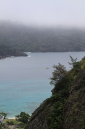 | 途中で振り返ると、二見湾がきれいに見えました。 でも、向こうの山は相変わらずガスだらけ。 このまま登っても大丈夫なのだろうか? |