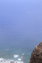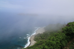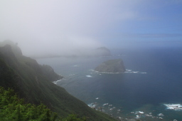 | 二見湾と反対側の北の方です。 ガスがかかってよく見えません。 ガスが下から湧き上がっているのがわかりますか? そうです。このガスは湿った海風が島の断崖にぶつかって 発生していたのです。 |