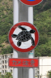 な、なんと!「カメ注意」です。 前代未聞です! タヌキやシカなどの動物は見たことありますが… 実はとびうお桟橋付近は昔砂浜だったそうです。 そのため、カメが産卵に上がってきてしまうことがあるそうです。 |