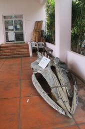 | 入るとまずは、お土産物などを売っているところになります。 その先は外に出るようになっています。 出て最初にお出迎えしてくれるのは、 ニタリクジラのガイコツさんです。 海洋センターはウミガメだけでなく、イルカやクジラに関する 活動も行っているようでした。 |
