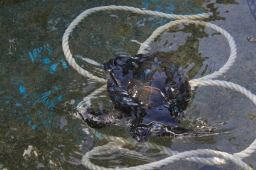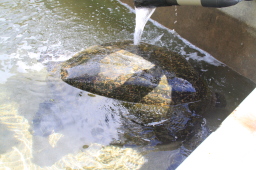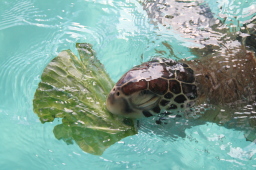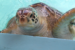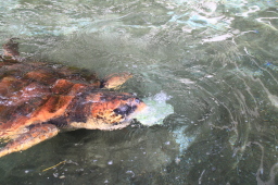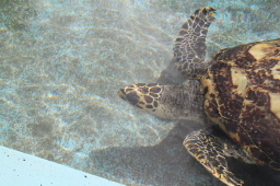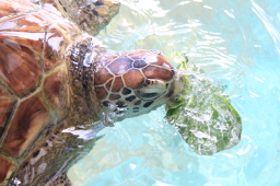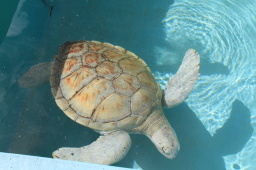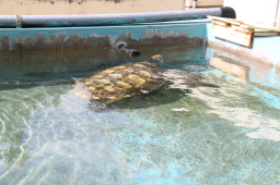 | 外のプールには巨大なウミガメがいました。 おそらく海洋センターで飼育されている中では最大のものと思います。 餌を投げ入れたときの迫力はたいしたもんです。 |