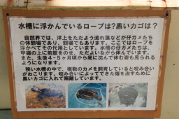 | 子ガメの水槽の中にある籠やロープの説明がありました。 子ガメって、泳ぎ疲れちゃうんですねぇ〜。 知りませんでした。 |