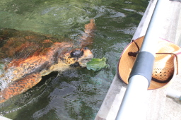 | 100円でエサやりができるようでした。 人が近づくだけで、水から顔をあげて催促してきます。 1m近い大物がエサをねだる姿は迫力があります。 |