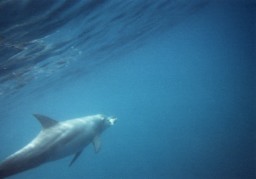 こうなってしまうと、もう人間では追いつけません。 この写真は水面とイルカのコントラストがきれいです。 これで正面からだったら、お気に入りの一枚だったのですが |