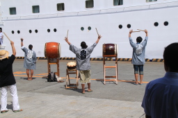 | 出港前の太鼓が始まりました。 定番のようです。 でも、毎回のことなのにここまでするとは、いかに おが丸が重要かということがわかります。 |